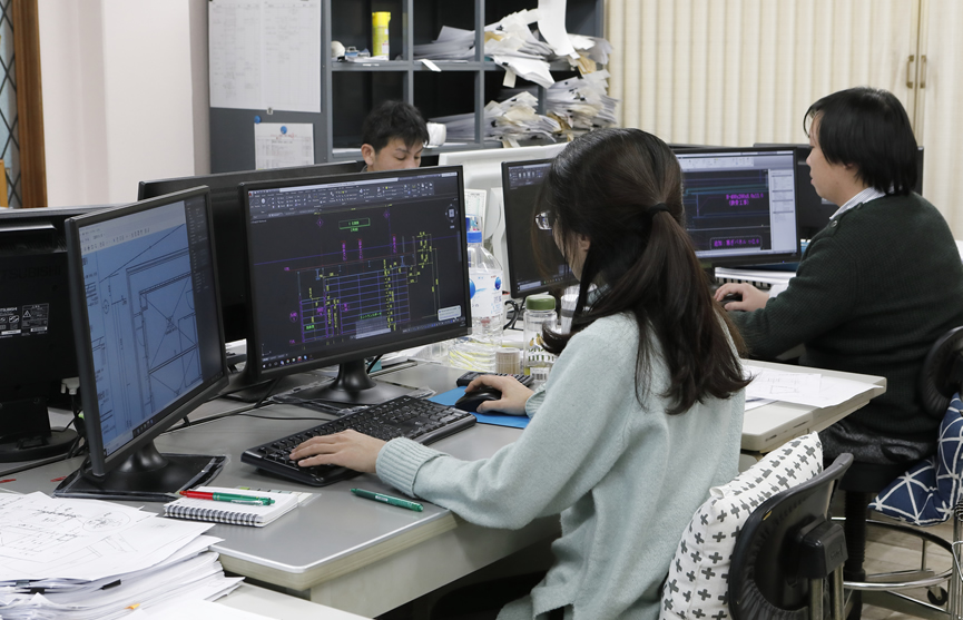 設計の仕事は、当社の全ての作業のもっともベースとなる部分ですから、ここでトラブルがあれば全体の流れに影響を与えてしまいます。そのため、納期が短い場合や複雑な案件などではプレッシャーも大きいですが、やりがいも格別です。